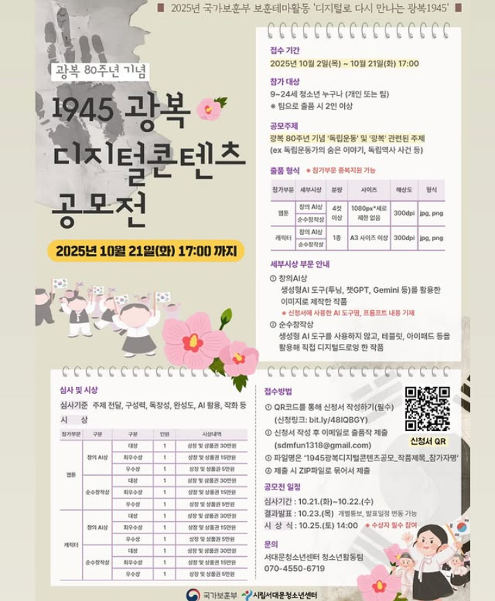2025년 서대문청소년센터 1945 광복 디지털콘텐츠 공모전 참가자 모집(~10.21)