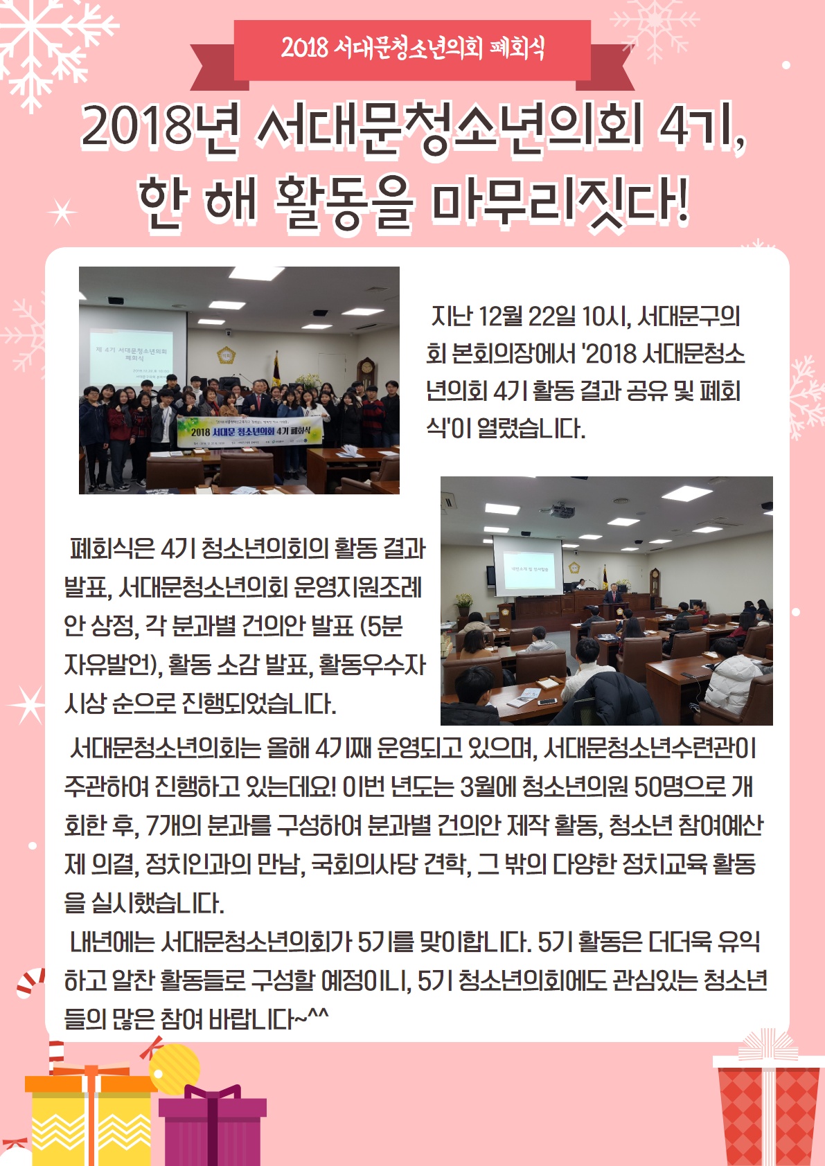 | 제목 | [청소년의회] 2018년 서대문청소년의회 폐회식 | |||