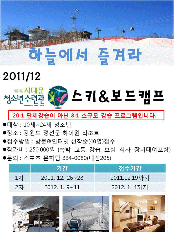 | 제목 | 겨울방학 2011/12 스키 & 보드캠프 모집 | |||