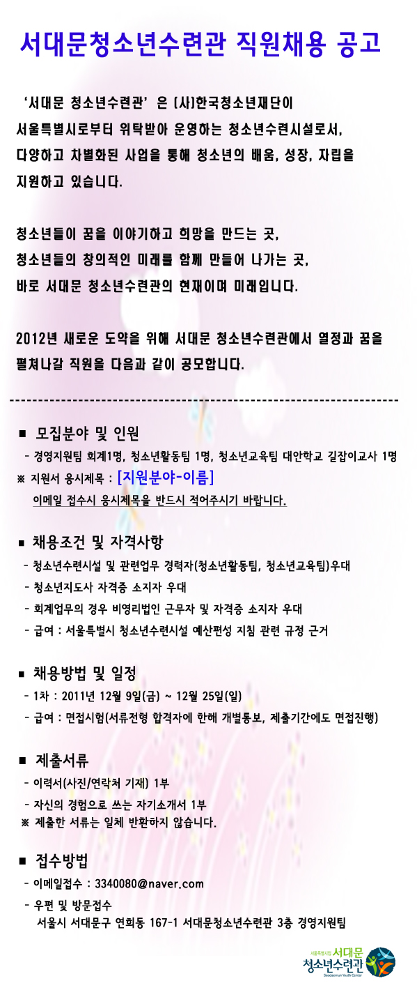 | 제목 | 서대문청소년수련관 직원 채용 공고 | |||