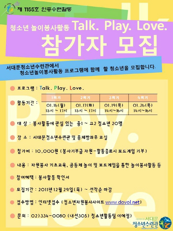 | 제목 | 청소년놀이봉사 \"Talk. Play. Love\" | |||