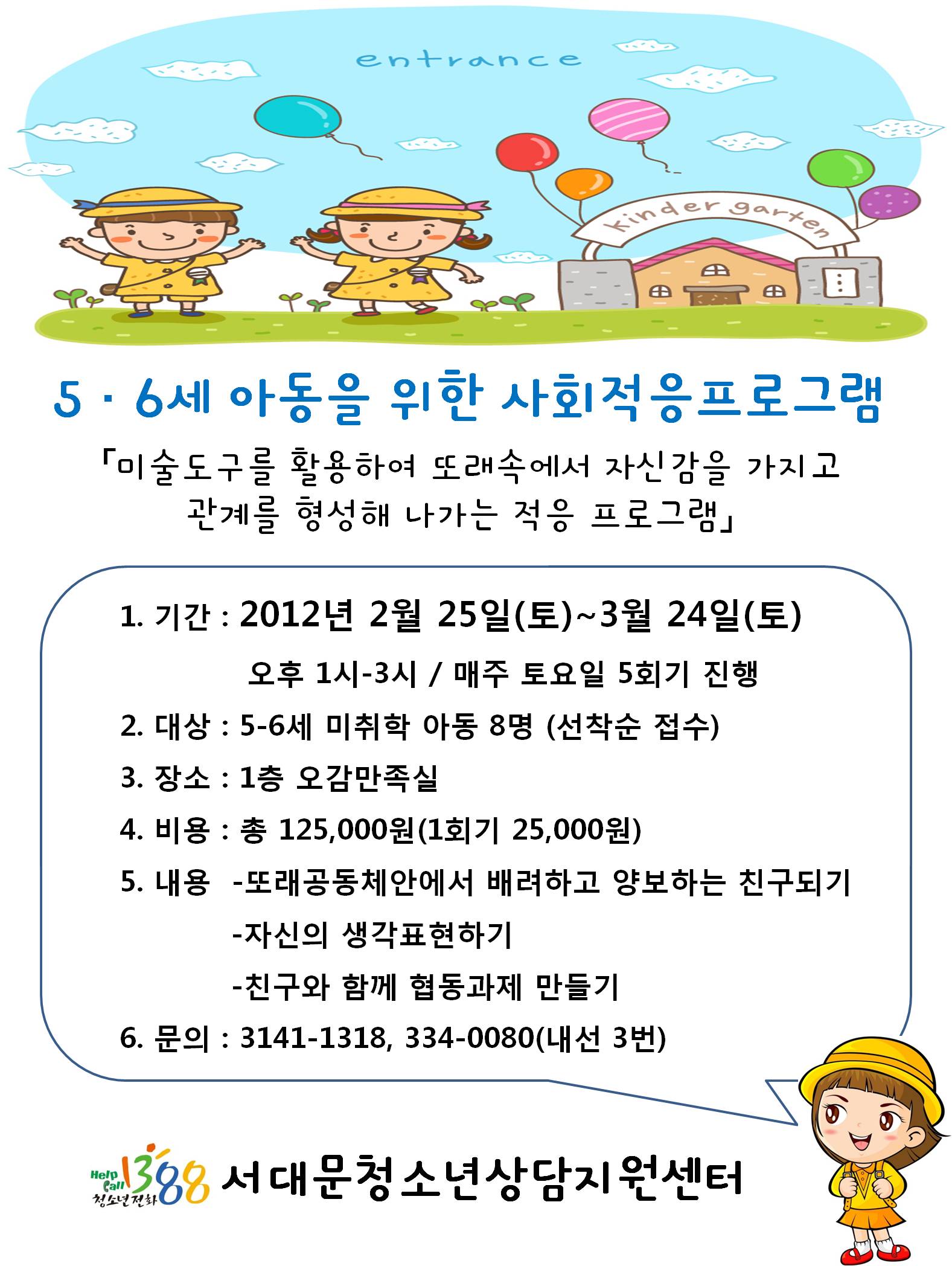 | 제목 | 5·6세 아동을 위한 사회적응프로그램 참가자 모집 | |||