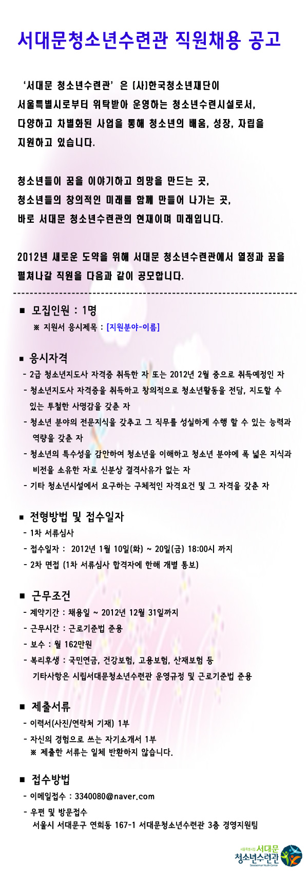 | 제목 | 2012년 청소년지도사 직원채용 모집 공고 | |||