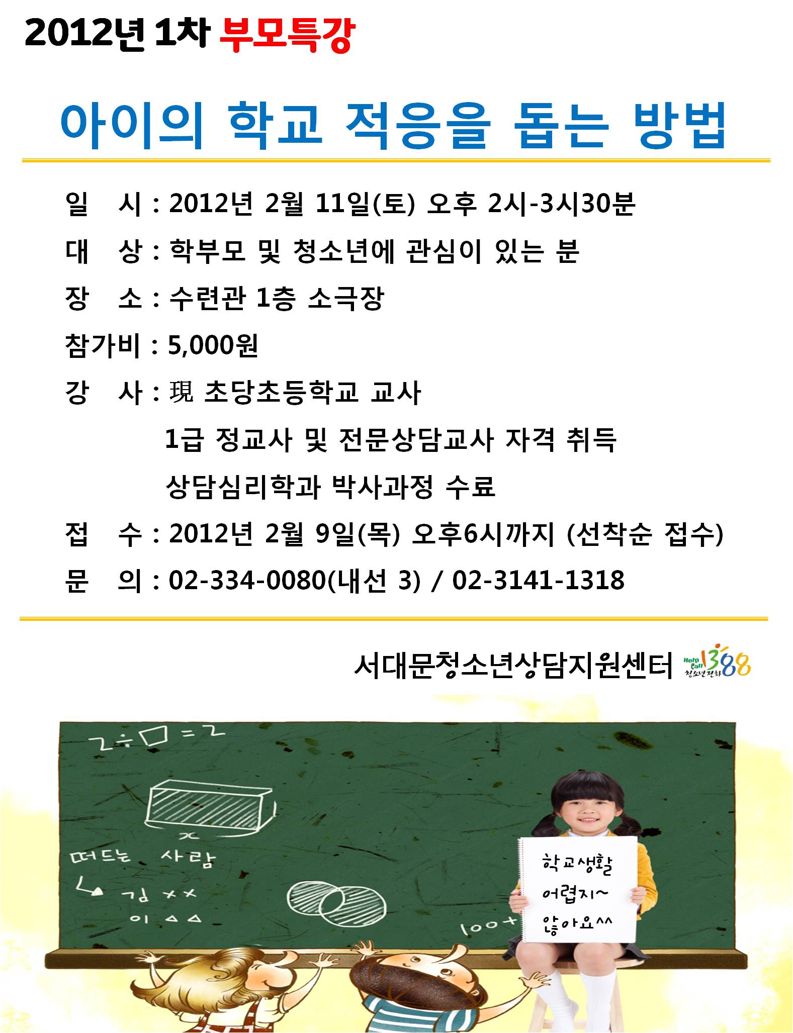| 제목 | 2012년 1차 부모특강 「아이의 학교 적응을 돕는 방법」 | |||