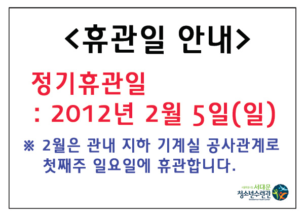 | 제목 | 2012년 2월 수련관 정기휴관일 안내 | |||