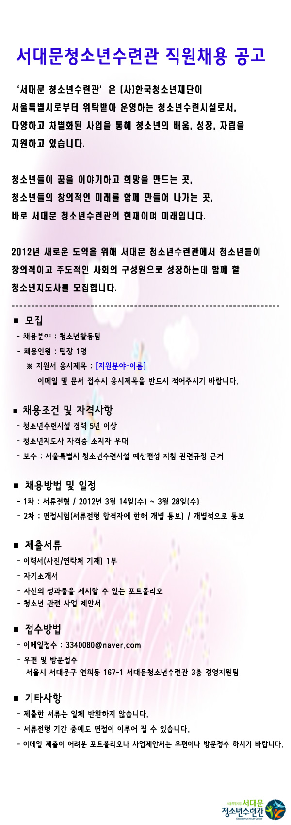 | 제목 | 서대문청소년수련관 청소년활동팀 직원채용 모집공고 | |||
