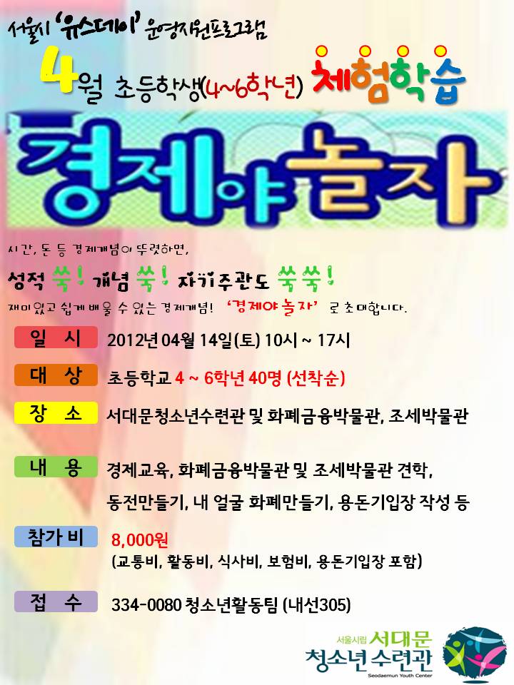 "경제야 놀자" 일 시 : 4월 14일 (토) 대 상 : 초4~6학년 참가비 : 8,000원 문 의 : 334-0080 (305) |