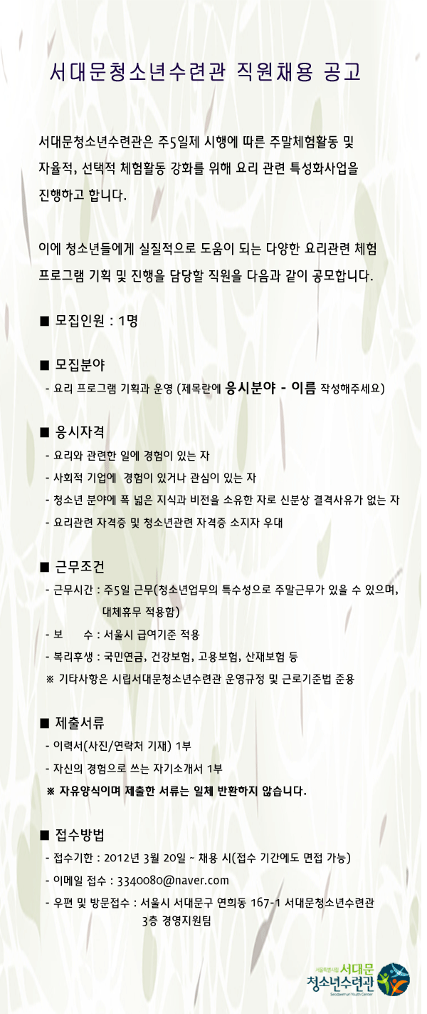 | 제목 | 서대문청소년수련관 직원채용 공고(청소년 주말체험활동 요리스튜디오) | |||