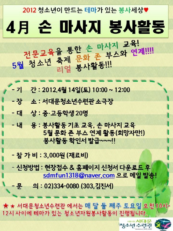 | 제목 | 2012년 4월 청소년자원봉사활동 \"손마사지\" | |||