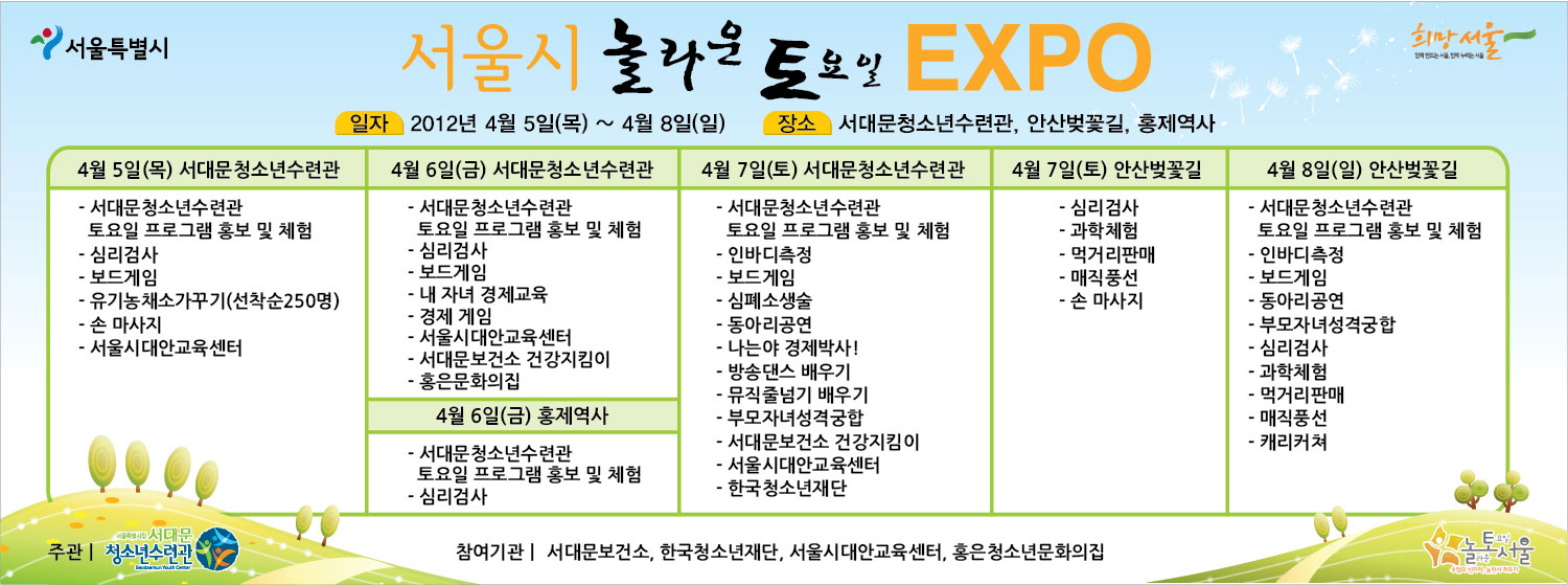 -행사일자 : 4.5(목)~6일(금) 전시부스 - 14:00~20:00 4.7(토)~8(일) 전시 및 체험부스 - 10:00~19:00 -장 소 : 서대문청소년수련관, 안산길, 홍제역사 -대 상 : 서대문구내 청소년 및 학부모, 지역주민 -내 용 : 내자녀 경제교육(특강), 유기농채소가꾸기, 심리검사, 먹거리 등 |