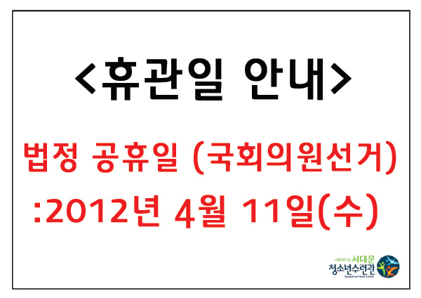 | 제목 | 서대문청소년수련관 4월 법정공휴일 안내 | |||