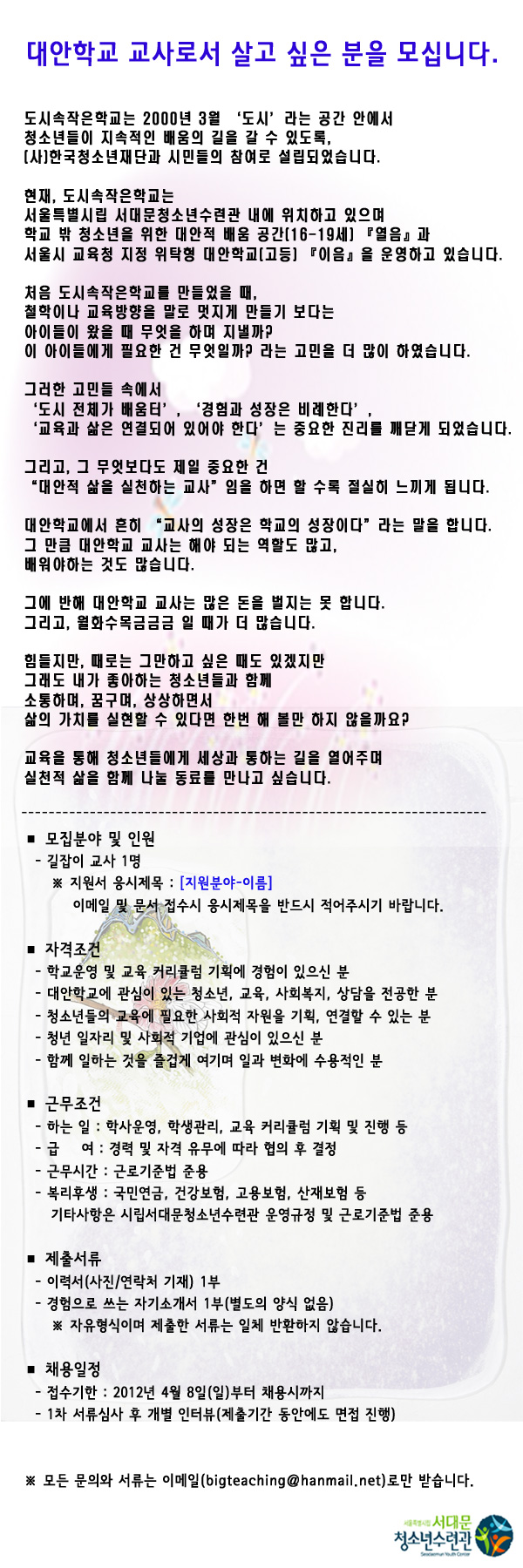 | 제목 | 서대문청소년수련관 청소년교육팀 직원채용 모집공고 | |||