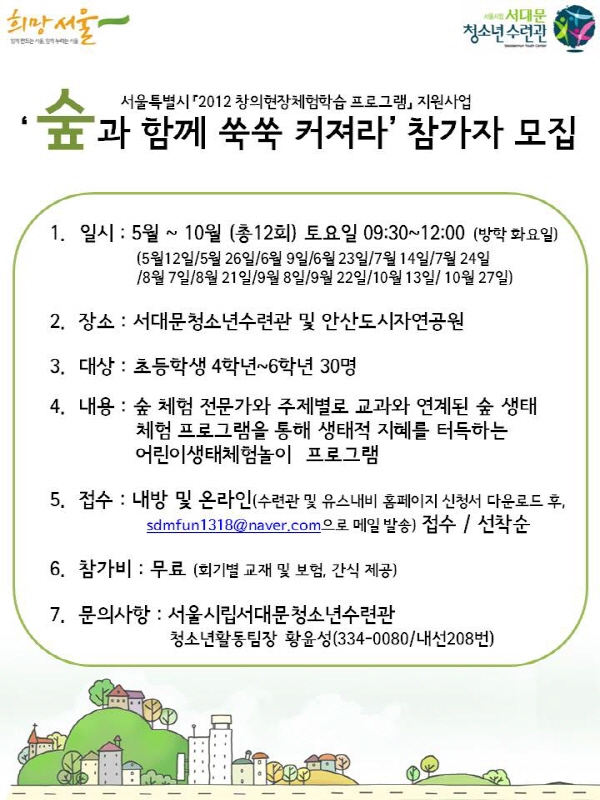 | 제목 | \'숲과 함께 쑥쑥 커져라\' 참가자 모집 - 2012 창의현장체험학습 프로그램 | |||