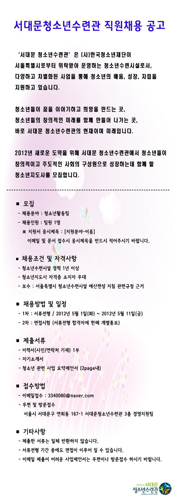 | 제목 | 서대문청소년수련관 청소년활동팀 직원채용 모집공고 | |||