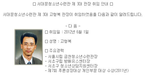 | 제목 | 서울시립 서대문청소년수련관 제 3대 관장 취임 안내 | |||