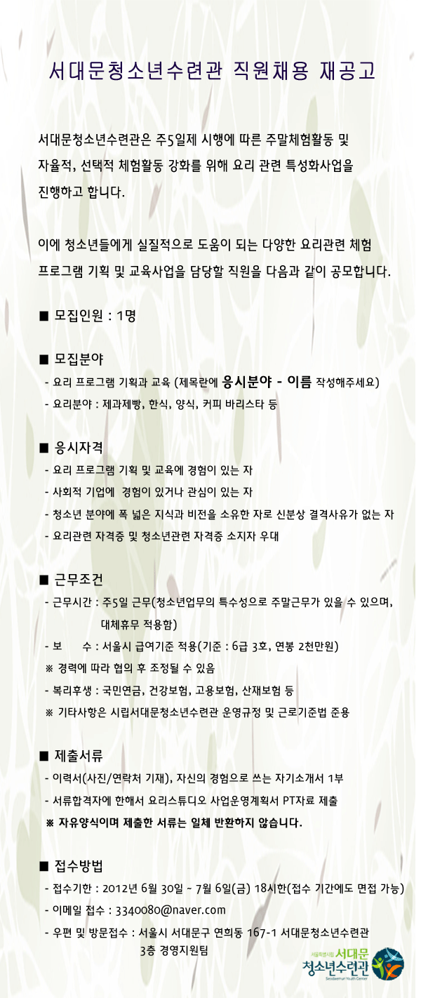 | 제목 | 서대문청소년수련관 요리스튜디오 기획/운영 직원채용 | |||