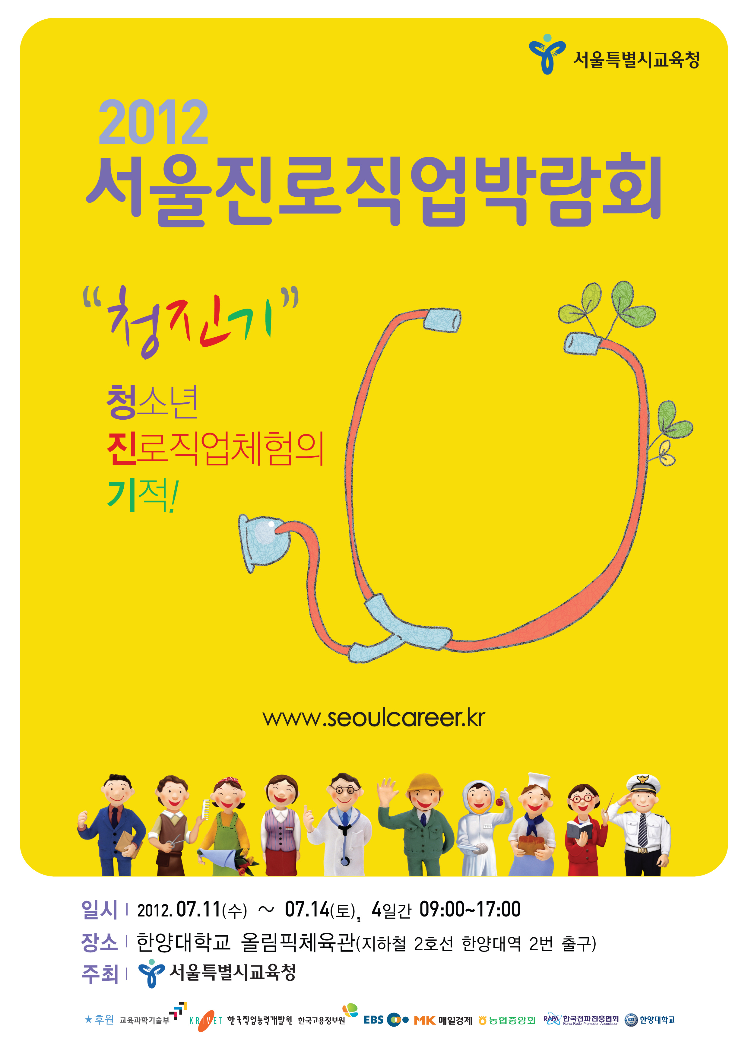 1) 기간 : 2012.7.11(수) ~ 7.14(토) 09:00 ~ 17:00 - 오전 : 09:00~12:30, 오후 : 13:30~17:00. 2) 장소 : 한양대학교올림픽체육관(지하철 2호선 한양대역 2번 출구) 3) 박람회장 구성 : 진로설계관, 진로상담관, 학부모관, 직업세계관, 이벤트관, 직업체험관, 진로동아리 체험관, 특성화고 체험관, 직업 멘토관 4) 학교별 단체 신청 현황 : 7.11(수)~7.13(금)은 신청 마감. 7.14(토)은 학생 및 학부모, 시민, 유관 기관 등의 자유 관람 가능 나. 유의사항 1) 중, 고 학생은 아래검사 중 1개를 선택, 실시 후 결과지를 출력 지참 - 서울진로진학정보센터(jinhak.or.kr)>진로적성검사>성격유형, 직업흥미, 다중지능검사>결과지출력 - 청소년워크넷(work.go.kr)>직업심리검사>청소년직업흥미검사>결과지출력 - 커리어넷(career.go.kr)>검사, 프로그램>심리검사>직업흥미검사 간편형>결과지출력 2) 서울진로직업박람회에 성실하게 참여한 학생은 진로활동 이수증 발급 예정 ※ 당일 박람회에서 배부하는 핸드북을 작성, 설문지 제출 후 개별 발급 3) 박람회 홈페이지 : http://seoulcareer.kr. 7.14(토)의 학부모 대상 강연은 홈 페이지에서 사전 예약 실시(일부는 조기 마감됨. 50%는 현장 접수함) 4) 본 박람회 참가 학생이 소감문을 작성후 에듀팟(edupot.go.kr) 진로활동 섹션에 등재하면 진로교사 또는 담임교사가 승인함 5) 학부모는 행사 기간 동안 자유롭게 관람 및 학부모관에서 상담 가능 |