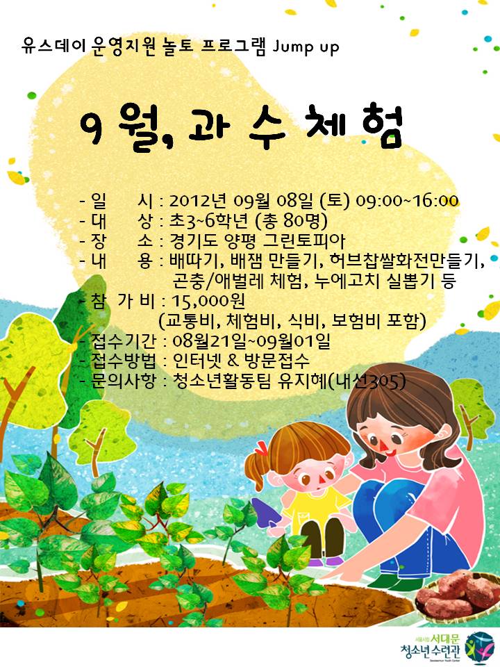 | 제목 | 유스데이 Jump up 9월 과수체험(신청마감) | |||