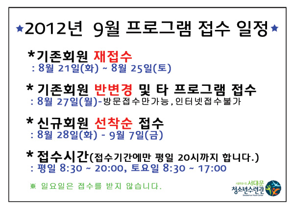 | 제목 | 2012년 9월 프로그램 접수일정 안내 | |||