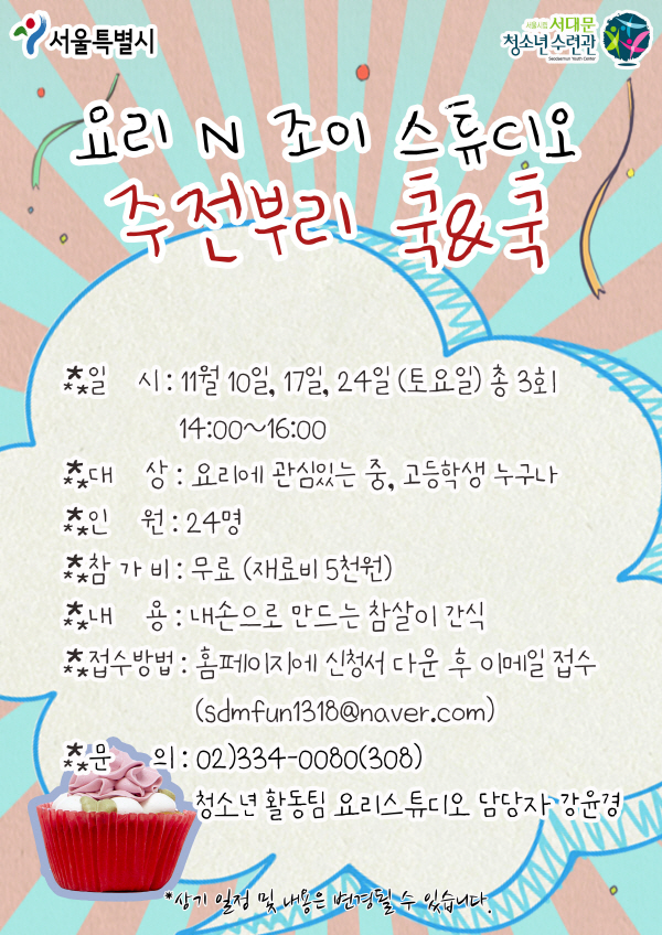 | 제목 | 특성화사업 요리&조이 주전부리 쿡&쿡 참가자 모집 | |||