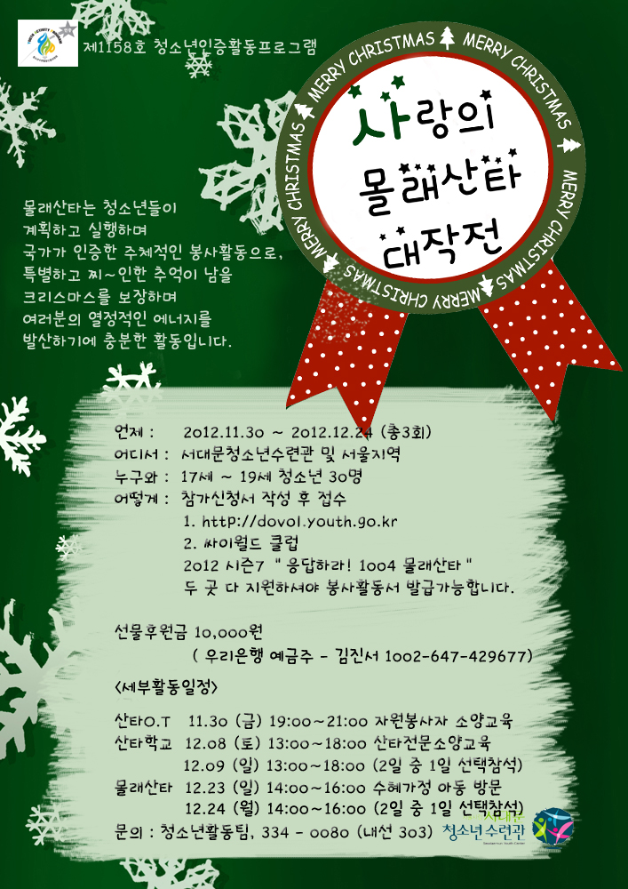 | 제목 | 시즌7 응답하라! 1004 청소년 몰래산타 대모집!! | |||