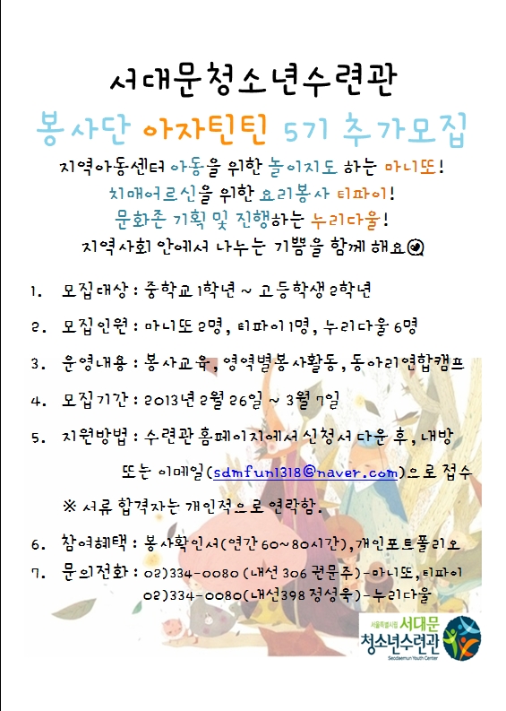 | 제목 | 서대문청소년수련관 청소년봉사단 아자틴틴 5기 추가모집 | |||