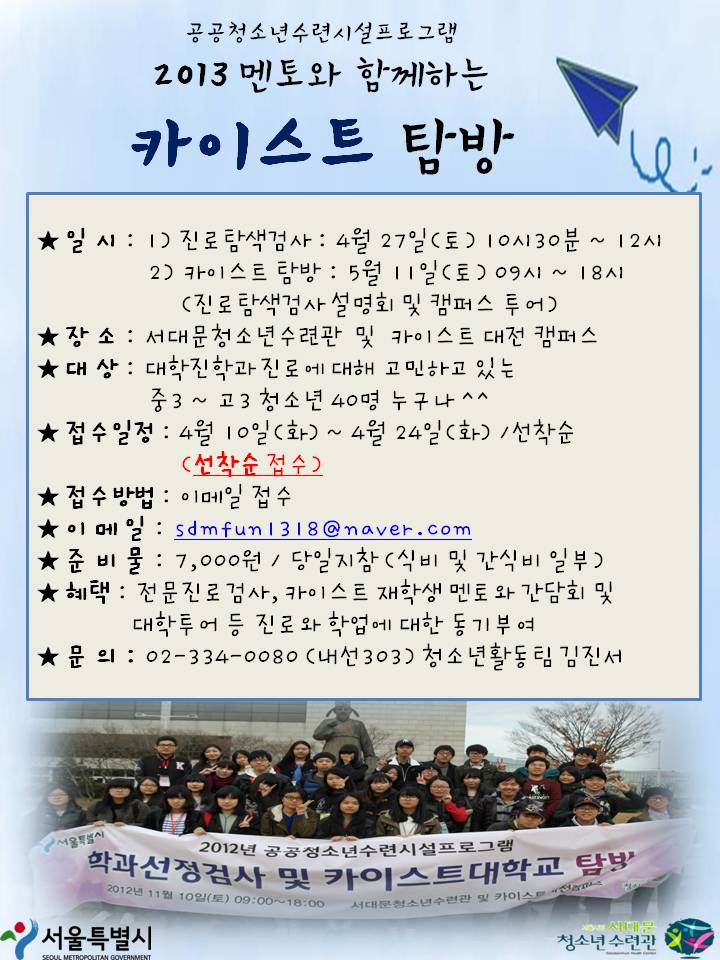 | 제목 | 멘토와 함께하는 카이스트 탐방 청소년 모집 | |||