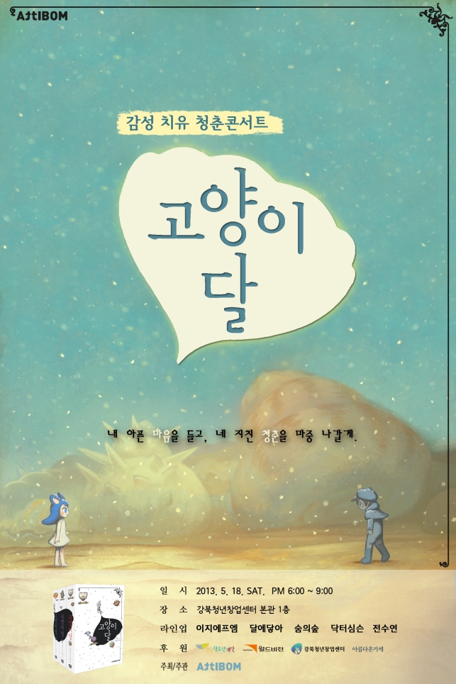 <감성 치유 청춘콘서트, 고양이달> 열정, 패기, 무모함, 도전. 흔히 청춘하면 떠올리는 강렬한 단어들이다. 끓어오르는 젊음의 에너지를 주체하지 못하고, 무조건 달려야만 할 것 같은 청춘. 어쩌면 그런 이미지 때문에 열정을 강요받는 건 아닐까. 그러나 현실의 청춘들은 고달프고, 불안하고, 숨 가쁘다. 그런 청춘들에게 “파이팅!”을 외치는 것도 좋지만 가끔은 쉬어 가도 괜찮다며, 따뜻한 손을 내민 콘서트가 있다. 지친 청춘들의 감성을 어루만져 줄 <감성 치유 청춘콘서트, 고양이달>. 이는 청춘이 청춘을 위해 기획한 콘서트이다. 청춘 벤처기업 아띠봄은 지난 4년 간 골방에 틀어박혀 어른을 위한 동화, <고양이달>의 기획부터 창작, 편집, 출판, 유통, 마케팅까지 전 과정을 독립적으로 진행하면서 고군분투해왔고, 그 과정에서 <고양이달>을 통해 많은 위로를 받았다. 그러한 위로가 또 다른 골방에서 홀로 고군분투하는 청춘에게 전해지길 바라는 마음에 <감성 치유 청춘콘서트, 고양이달>이 탄생했다. <감성 치유 청춘콘서트, 고양이달>(본 공연에서는) 청춘 밴드들이 감성적인 공연을 펼치면서 동시에 이 시대 청춘으로서의 진솔한 속내를 드러내어, 고달픈 현실에 지친 마음을 서로 따뜻하게 어루만져 줄 예정이다. “내 아픈 마음을 들고, 네 지친 청춘을 마중 나갈게.” 청춘들의 지친 마음을 어루만져 줄 따뜻한 동화 감성의 콘서트 <감성 치유 청춘콘서트, 고양이달>에는 소녀들의 성장통을 ‘달빛처럼 은은하게 노래하는’ 서정적인 팝 발라드 여성 듀오 ‘달에닿아’, 소소한 일상의 노래로 ‘숨을 만드는 숲’이 되고픈 인디팝 혼성 듀오 ‘숨의숲’, 사랑과 이별의 편지 같은 노래로 ‘쉽게 마음의 문을 열게 만드는’ 혼성 5인조 밴드 ‘Easy FM’이 청춘 밴드로 참여하며, 여기에 뉴에이지 아티스트인 전수연의 감미로운 피아노 공연과 힙합 래퍼 ‘닥터심슨’의 흥겨운 공연이 더해져 다채로운 감성을 느낄 수 있다. 이들의 공연은 그저 단순한 공연으로 그치지 않는다. 이들은 공연자인 동시에 연사가 되어 어른을 위한 동화, <고양이달>의 주요한 키워드인 ‘꿈’, ‘사랑’, ‘청춘’, ‘성장’, ‘위로’라는 테마를 가지고, 이 시대 청춘으로서의 고군분투기를 진솔하게 풀어낼 예정이다. 여기에 청춘 벤처기업 아띠봄도 가세한다. 청춘들의 꿈과 사랑, 실패와 성장에 관한 이야기를 <고양이달>에 고스란히 담아낸 이들은 아띠봄 밴드로 깜짝 변신해 작품의 배경이 된 본인들의 이야기를 소소한 노래와 함께 들려준다. 그동안 어디서에서도 들을 수 없었던, 청년 예술가들의 꿈과 사랑, 실패와 성장에 대한 진솔한 이야기는 <감성 치유 청춘콘서트, 고양이달>에서만 만나볼 수 있다. 또한 <감성 치유 청춘콘서트, 고양이달>에는 관객들을 위한 깜짝 이벤트, ‘너만십분콘서트’도 준비되어 있다. 소중한 이에게 평소에 전하지 못했던 마음을 사전에 받아, 사연이 선정된 관객에게는 <고양이달>의 주인공 아리와 청춘 밴드가 정성을 다해 그 마음을 전하고 사연의 주인공만을 위해 노래를 불러준다. ‘나의 소중한 마음’를 전하는데 밴드와 관객들 모두가 온 정성을 모아 주는 십 분간의 콘서트. 소중한 이에게 잊지 못할 십 분을 선물하기에 제격이다. “아이들에겐 꿈과 사랑이 담긴 동화를, 청춘들에게는 진심 어린 위로를!” 사랑을 주고받는 사람 모두 행복해지는 ‘힐링’ 콘서트 <감성 치유 청춘콘서트, 고양이달>의 참여 방법은 조금 독특하다. 아띠봄 출판사는 오는 5월 <고양이달> 전 시리즈 발간을 기념하여, 책이 한 권 팔리면 한 권을 자동적으로 불우 아동에게 기증하고 책을 구매한 이들에게는 <감성 치유 청춘콘서트, 고양이달>의 초청장을 보내는 One For One Book Project를 한국청소년재단과 손잡고 진행하고 있다. 아띠봄은 한국청소년재단과 함께 ‘고양이달 몰래싼타’를 진행하여 산타와 고양이달의 주인공 아리와 함께 아이들에게 고양이달 동화를 선물하고 캐롤을 불러주는 등 사랑을 선물하면서 한국청소년재단과 연을 맺게 되었으며, 이번 공연이 끝난 뒤에도 ‘봄날의 산타’가 되어 꿈과 사랑이 담긴 동화 <고양이달>을 선물하러 간다. 아이들에게는 마음껏 꿈꾸고 상상할 수 있는 기회를, 청춘들에게는 지친 마음을 조용히 어루만지며 서로 위로할 수 있는 기회를 선물하는 것, 그것이 바로 고양이달 One For One Book Project의 핵심이다. 감성을 나누고 사랑을 선물하면서 함께 치유하는, <감성 치유 청춘콘서트, 고양이달>. 청춘들의 캄캄한 현실에 고양이달이 떠서 빛을 발할 때까지 <고양이달>은 쉬지 않고 달릴 예정이다. 고양이달 One For One Book Project는 온오프믹스 사이트(http://onoffmix.com/event/14666)를 통해 참여 가능하며, <감성 치유 청춘콘서트, 고양이달>은 오는 5월 18일 토요일 오후 6시 고양이달이 만들어진 강북청년창업센터에서 열린다. 더 자세한 내용은 고양이달 블로그(http://blog.naver.com/attibom)에서 확인 가능하다. |
