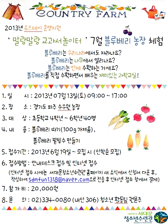 | 제목 | 유스데이운영지원 \'말랑말랑 교과서놀이터\' 7월 블루베리농장체험 참가자 모집 | |||
