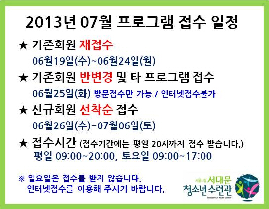 | 제목 | 2013년 07월 프로그램 접수일정 안내 | |||