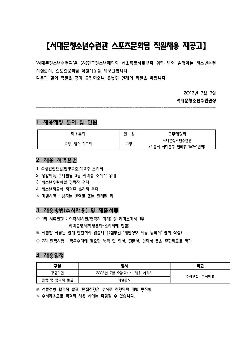 | 제목 | 서대문청소년수련관 스포츠문화팀 직원채용 재공고 | |||