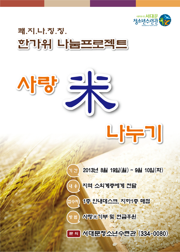 해마다 진행하고 있습니다. 2006년부터 시작된 사랑米 나누기 행사는 많은 분들의 정성이 모여 2012년까지 456개 기관 및 가정에 12,986kg의 사랑米를 전달하였습니다. 올해에도 서대문청소년수련관에서는 생활이 어려운 독거노인 및 저소득층 가정에 쌀을 전달함으로서 서대문구 지역 내에 따듯함을 전하는 공공기관의 역할을 수행하고자 합니다. 주민여러분의 관심과 사랑으로 모여진 쌀을 지역의 소외된 가정에 전달하고자 하오니 많은 관심과 참여를 부탁드립니다. |