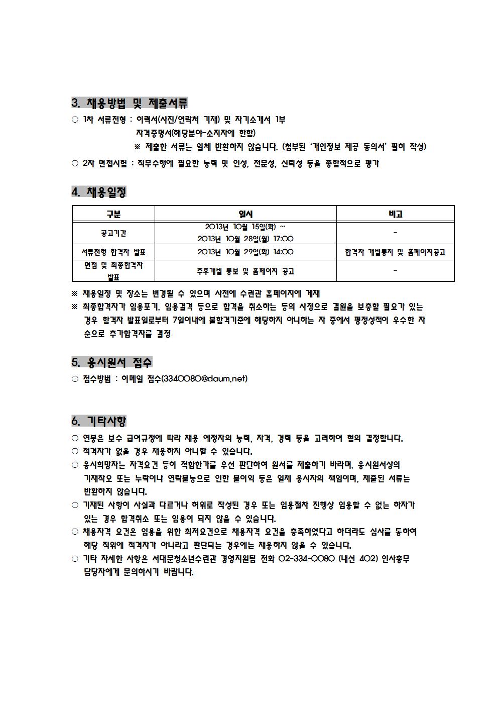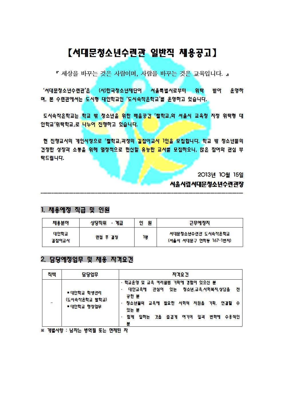| 제목 | 서대문청소년수련관 대안학교길잡이교사 채용공고 | |||