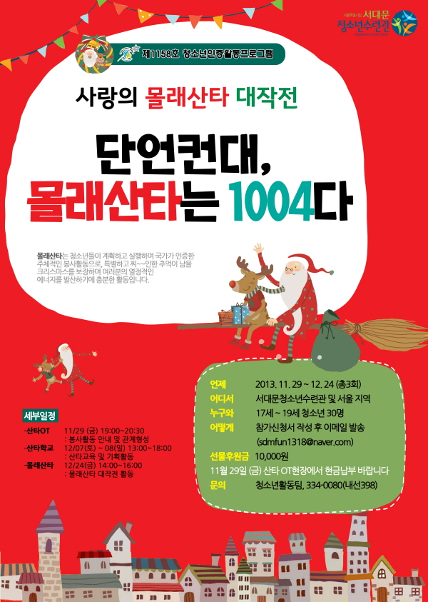 | 제목 | [청소년 산타 모집] 2013 시즌8 사랑의 몰래산타 대작전(마감) | |||