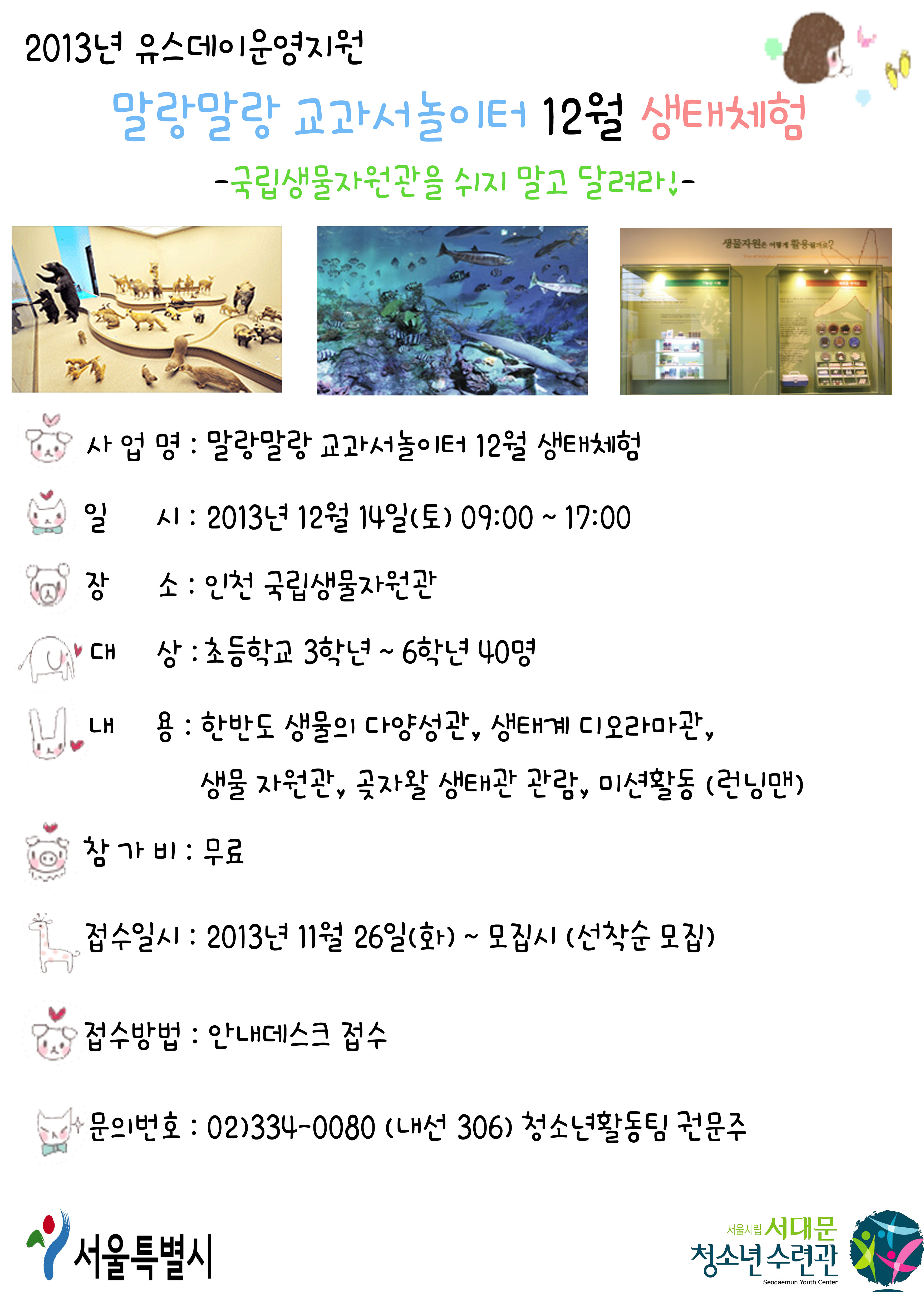 | 제목 | 유스데이운영지원 \'말랑말랑 교과서놀이터\' 12월 생태체험 모집(마감) | |||