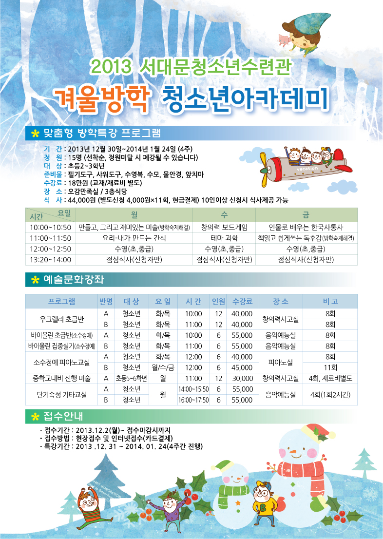 * 접수기간 : 2013.12.02(월)~ 선착순 마감 * 접수방법 : 방문접수 및 인터넷접수 * 수강기간 : 2013.12.30(월)~2014.01.24(금) |