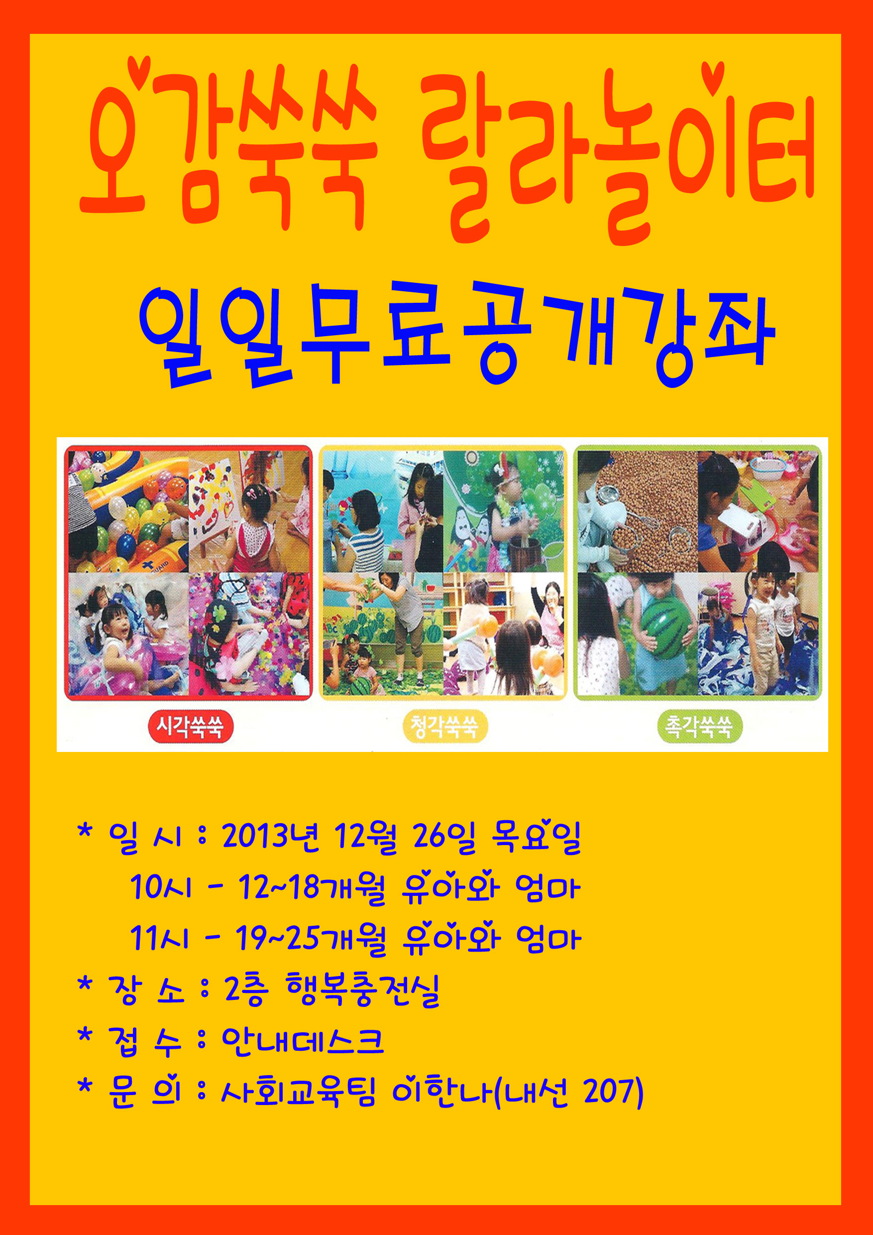 | 제목 | 오감쑥쑥 랄라놀이터(엄마랑 아가랑) 일일공개강좌 안내 | |||