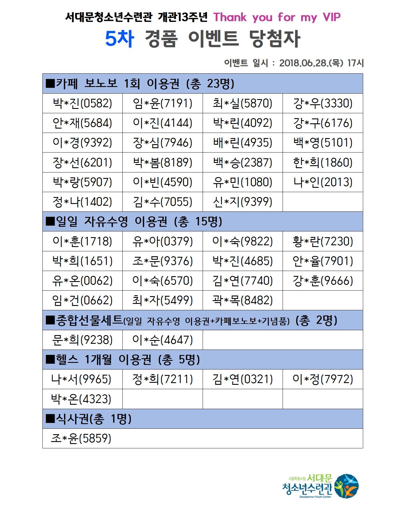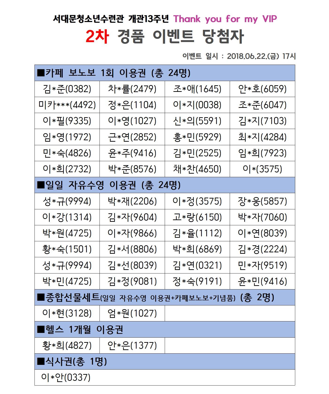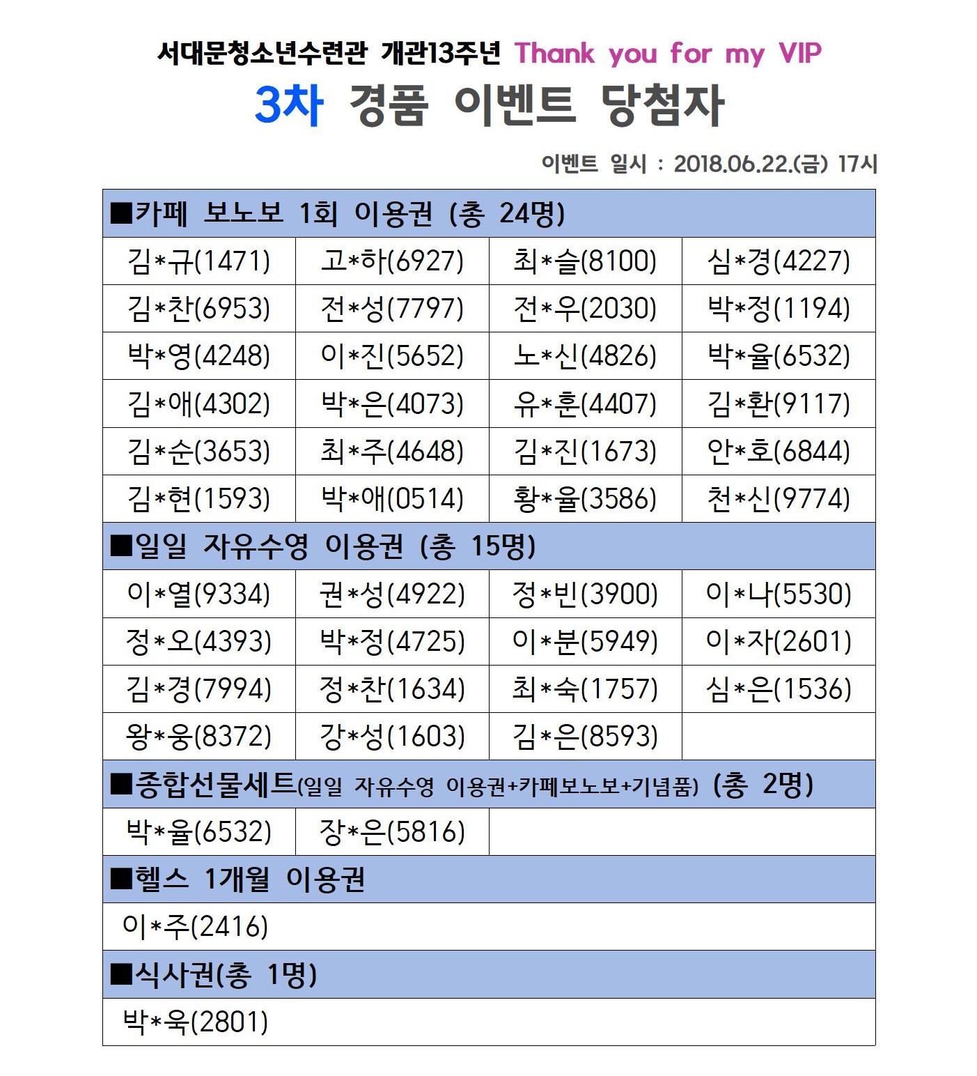 | 제목 | [공지]개관13주년 경품이벤트 당첨자 발표 | |||