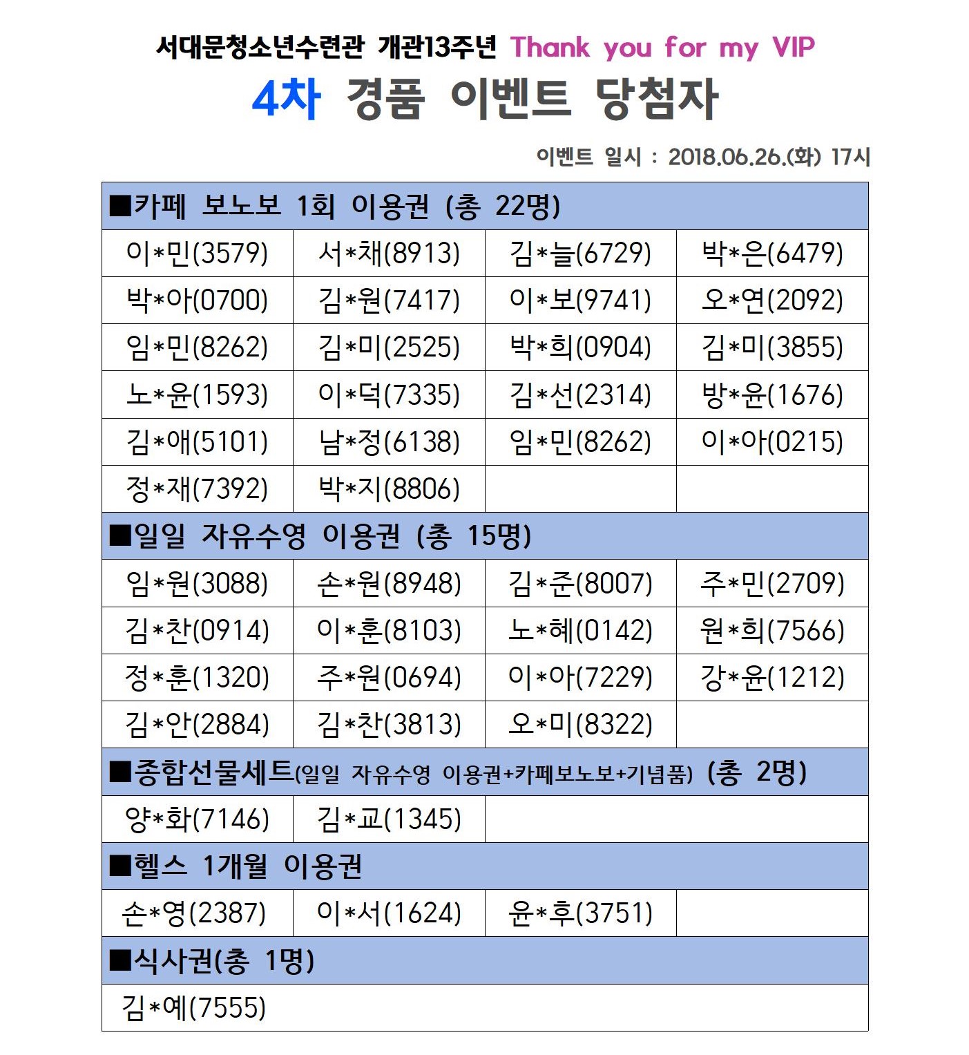 개관13주년 Thank you for my VIP 경품이벤트 당첨자 발표경품이벤트에 당첨되신 회원님들 진심으로 축하드립니다. 당첨되신 경품이용권은 1층 안내데스크에서 수령가능하십니다. 경품이용권 사용기한을 꼭 확인하시고 작지만 회원님에게 기쁨이 되는 경품이용권이 되었으면 합니다. 개관 14주년 더 풍성한 경품이벤트로 다시 돌아오겠습니다. 내년에도 많은 관심부탁드립니다. 개관 13주년 경품이벤트 행사에 참여해주신 모든 회원님들께 다시 한번 감사드립니다. |