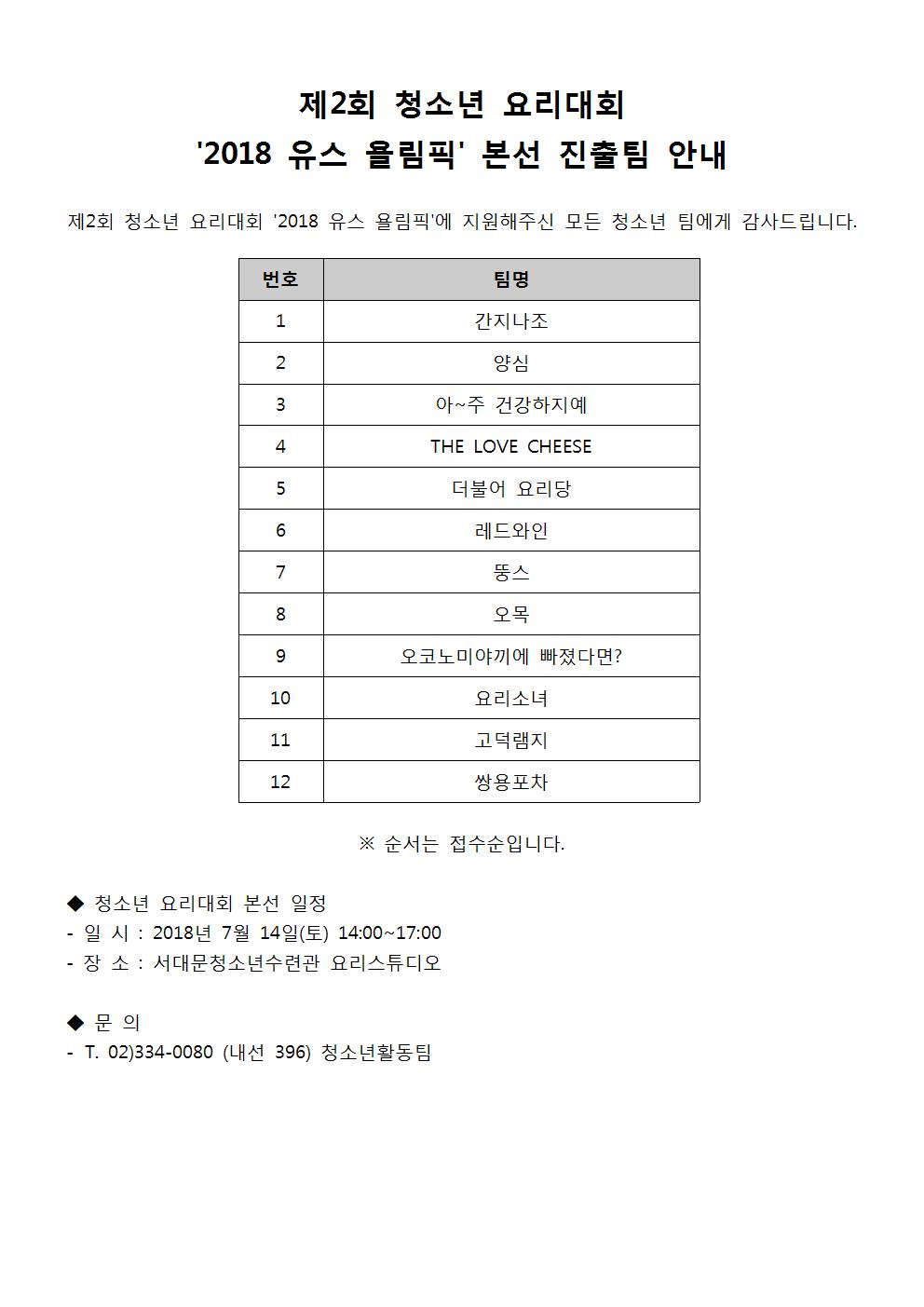 | 제목 | <청소년 요리대회> 본선 진출팀 안내 | |||